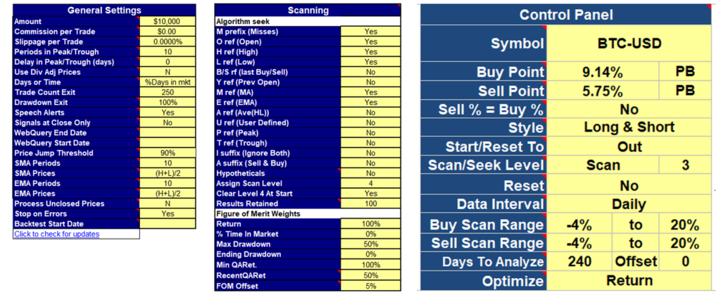 The Buy and Sell thresholds for this simulation (green and red lines on the time graph) used an adaptive technique every cycle to determine the optimum values, with the constraints Buy+Sell=100% and Buy>Sell. The optimum thresholds settled down pretty quickly to Buy=55% and Sell=45%. Return was $67,966 since 1/1/21 for a $10,000 outlay (CAGR 0f 273%), with Risk-Reward about 680 times that for Short-hold. The simulations assume the ability to both long and short the security, but the table includes both the Long and Short returns
