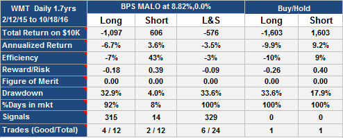WMT Daily. The tables show the annualized return of the trading strategy (50.8%) vs. buy and hold (14.7%) for the 2 year period 1/8/13 to 2/11/15. Drawdown was 6.2% vs. 10.5% for buy-hold. You can also see how you would have fared going only Long or Short or short-and-hold. The lower table describes the signals and the strategy in detail. The Long and Short strategy is described which requires holding the stock long or short at all times, however you would also have made a profit taking just the long or short side.
